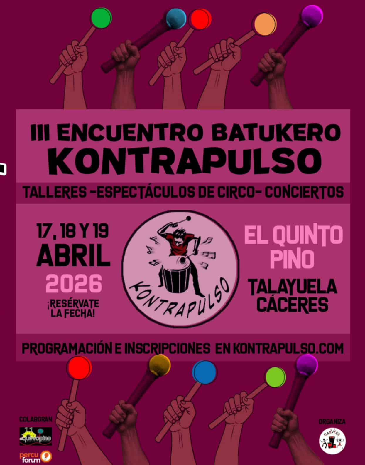El encuentro Kontrapulso regresa al Quinto Pino de Talayuela los días 17, 18 y 19 de abril. Este evento batuquero, con una vibrante esencia cirquense, se celebra en un entorno natural excepcional que convierte cada edición en una experiencia única.Si te apasiona la música, el ritmo y la naturaleza, Kontrapulso es una cita imprescindible.