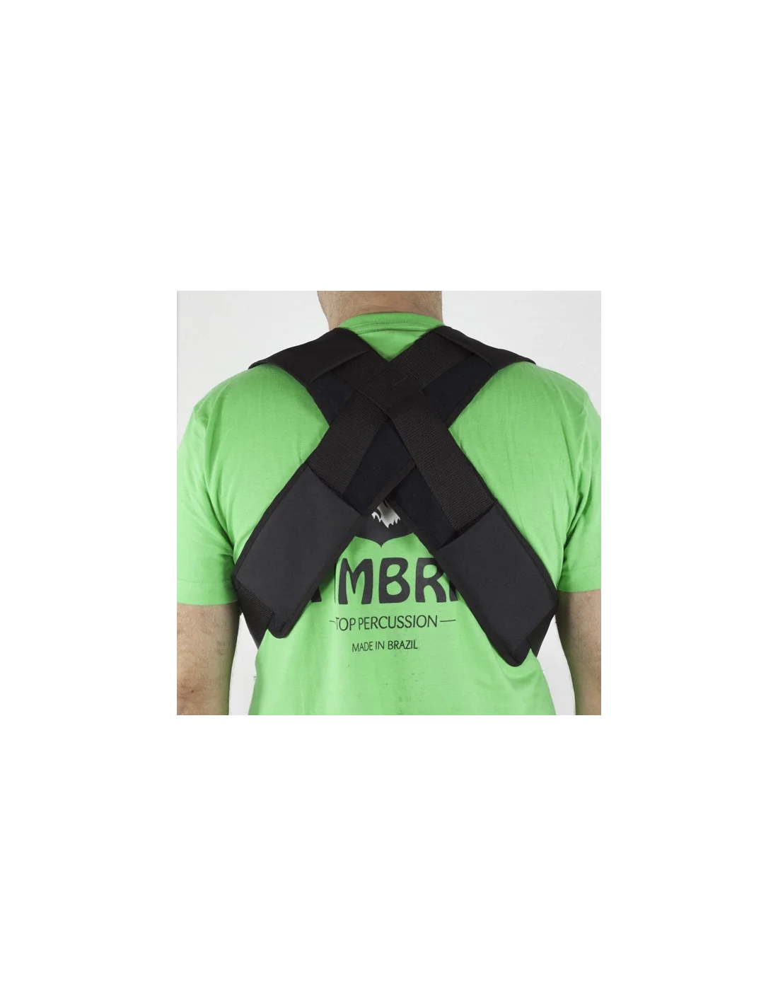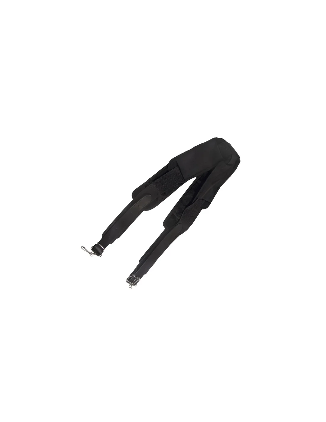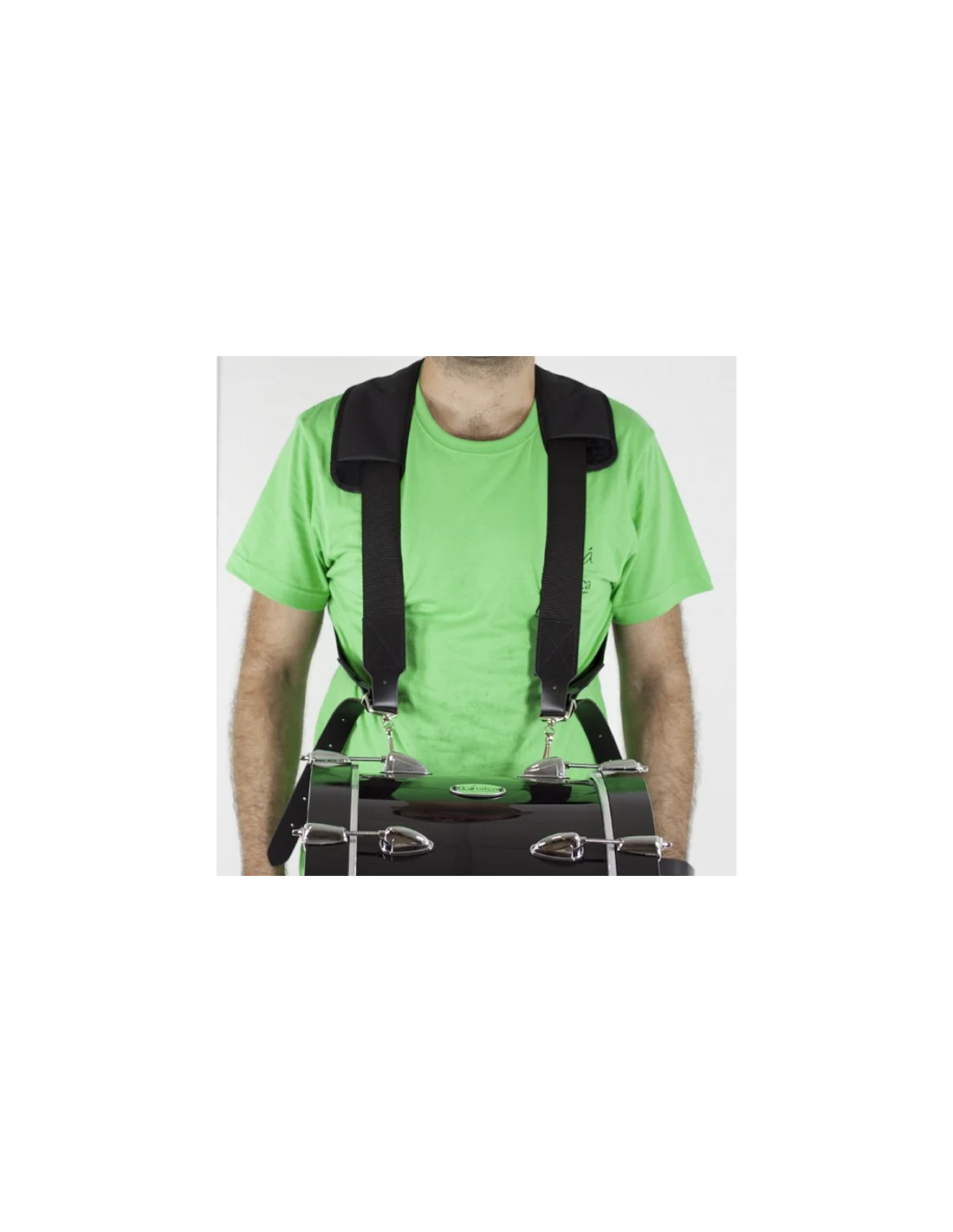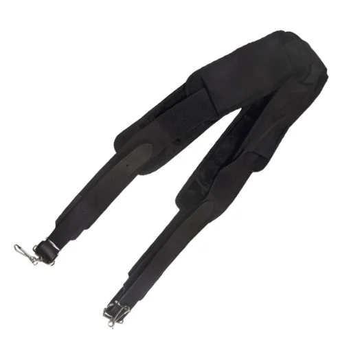 Spallacci imbottiti e imbracatura per grancassa in pelle. Larghezza 50 mm. Lunghezza minima 110 cm. Lunghezza massima 144 cm.